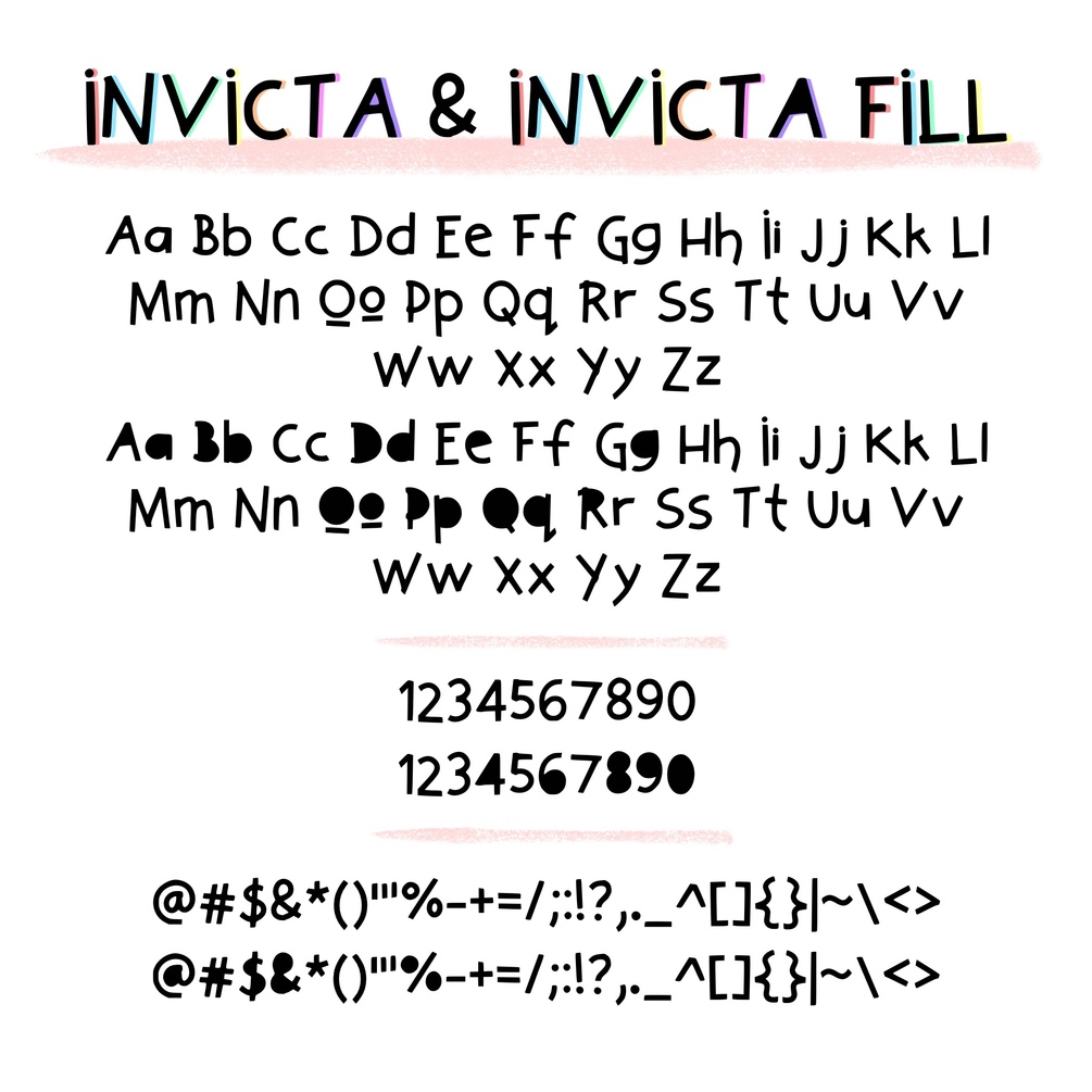 Invicta & Invicta Fill are two handmade playful typefaces with regular fonts. Invicta Fill has its characters' empty spaces filled with color. Both typefaces go perfectly with any color. With .ttf file formats, they are compatible for use in Procreate.
